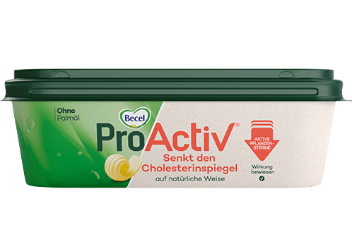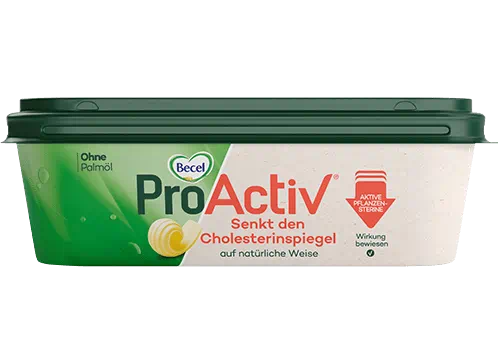 Becel ProActiv enthält Pflanzensterine. Ein täglicher Verzehr von 1,5 bis 2,4g Pflanzensterinen kann den Cholesterinspiegel in 2-3 Wochen um 7-10% senken. Eine Portion (10g) enthält 0,54g Pflanzensterine. Verwenden Sie 3 Portionen (30g) täglich. Verwenden Sie ProActiv im Rahmen einer gesunden Ernährung und Lebensweise mit viel Obst und Gemüse. Mehr als 3g Pflanzensterine täglich sollten nicht verzehrt werden.