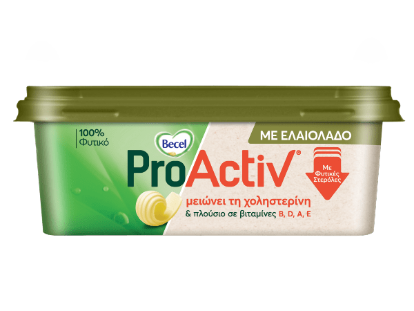 Το Becel ProActiv με Ελαιόλαδο, ο διατροφικός σύμμαχος … της καρδιάς μας εδώ και 20 χρόνια, περιέχει 7% ελαιόλαδο και πρόσθετες φυτικές στερόλες που είναι κλινικά αποδεδειγμένο ότι μειώνουν τη χοληστερίνη.