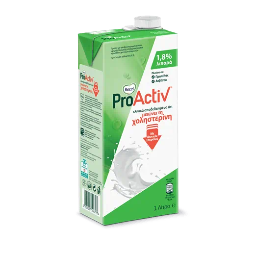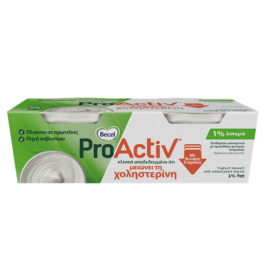 * Το Becel ProActiv περιέχει φυτικές στερόλες. Οι φυτικές στερόλες είναι κλινικά αποδεδειγμένο ότι μειώνουν τη χοληστερίνη στο αίμα. Η ημερήσια κατανάλωση 1,5-2,4g φυτικών στερολών μπορεί να μειώσει τη χοληστερίνη 7-10% σε 2-3 εβδομάδες από την έναρξη της κατανάλωσης, στο πλαίσιο μιας ισορροπημένης διατροφής και ενός υγιεινού τρόπου ζωής, η οποία περιλαμβάνει αρκετά φρούτα και λαχανικά.