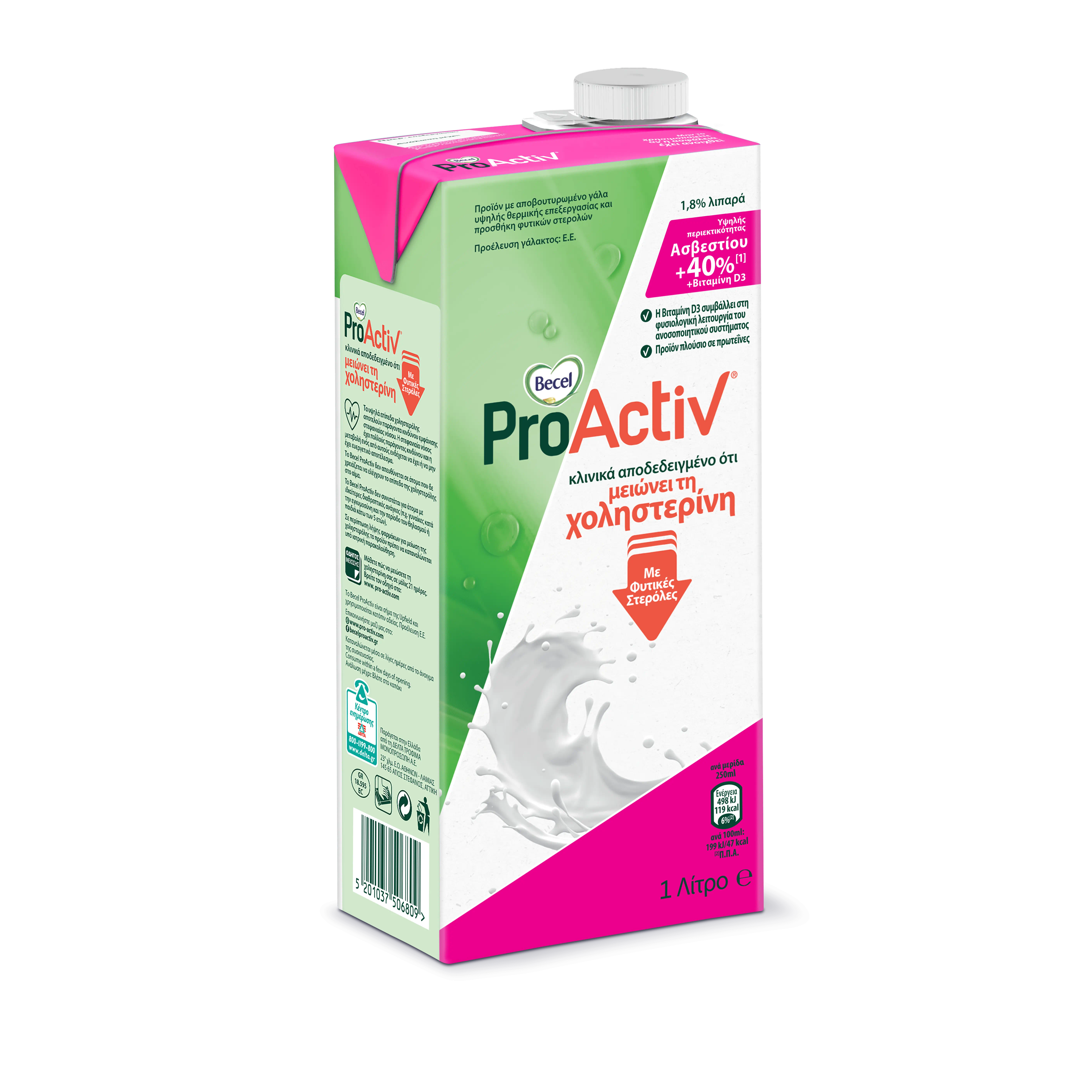 Το προϊόν Becel ProActiv με ημιαποβουτυρωμένο γάλα, προσθήκη φυτικών στερολών, ασβεστίου, βιταμίνης D3 και μόνο 1,8% λιπαρά, θα σας βοηθήσει να μειώσετε γευστικά τη χοληστερόλη σας.