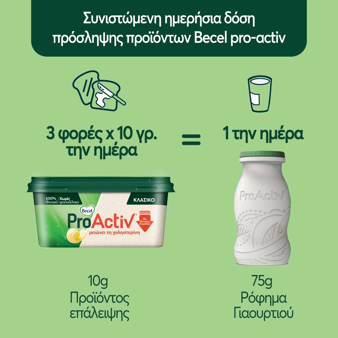 - 3 μερίδες από το προϊόν επάλειψης Becel ProActiv ή τα γαλακτοκομικά Becel ProActiv ή ένα ρόφημα γιαουρτιού Becel ProActiv την ημέρα, παρέχουν την απαραίτητη ποσότητα φυτικών στερολών για μείωση της «κακής» LDL-χοληστερίνης 7-10%, στο πλαίσιο μιας ισορροπημένης διατροφής και ενός υγιεινού τρόπου ζωής.