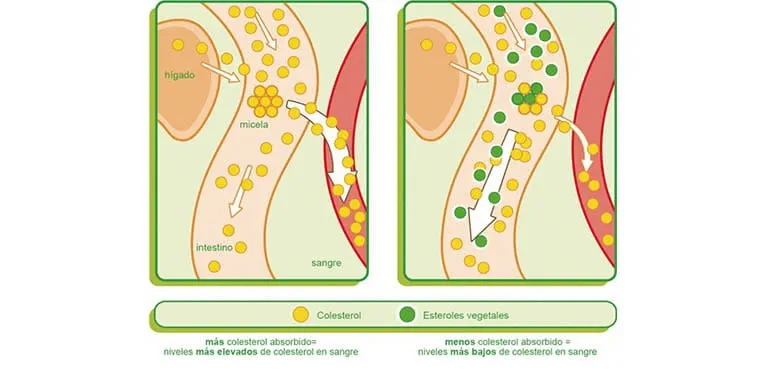 Cuando los esteroles vegetales se consumen en nuestra dieta, ayudan a eliminar el colesterol del intestino, evitando su paso al torrente sanguíneo. De esta manera, el colesterol que no se absorbe se elimina del cuerpo, lo que da lugar a una reducción de los niveles de colesterol total y colesterol LDL (malo).
