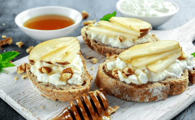 Impossible de résister à de tels petits toasts au fromage ! Surtout si vous servez cette version à la fois savoureuse et rafraîchissante : avec une couche de fromage de chèvre frais, de la pomme et de la menthe, votre petit déjeuner sera à coup sûr une réussite. Garnissez enfin le tout de tranches de pomme et de noix pour commencer délicieusement la journée.