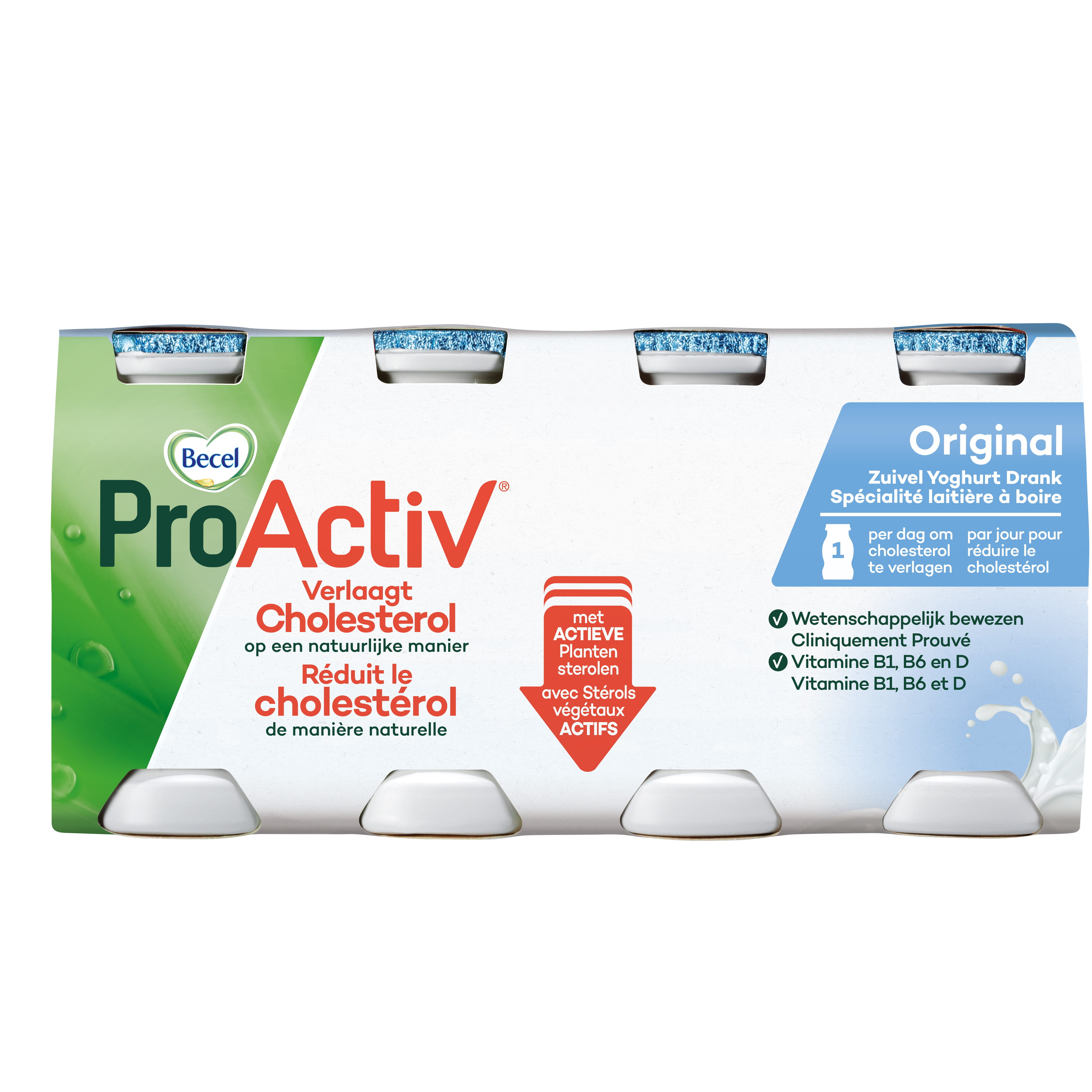 Becel ProActiv bevat de natuurlijke kracht van toegevoegde plantensterolen die actief het cholesterol verlagen. Drink dagelijks 1 flesje Becel ProActiv yoghurtdrink om het cholesterol te verlagen.* Voor een optimale cholesterolverlaging** kan je daarnaast nog 2 boterhammen (= 10 g) met Becel ProActiv voor op brood besmeren.